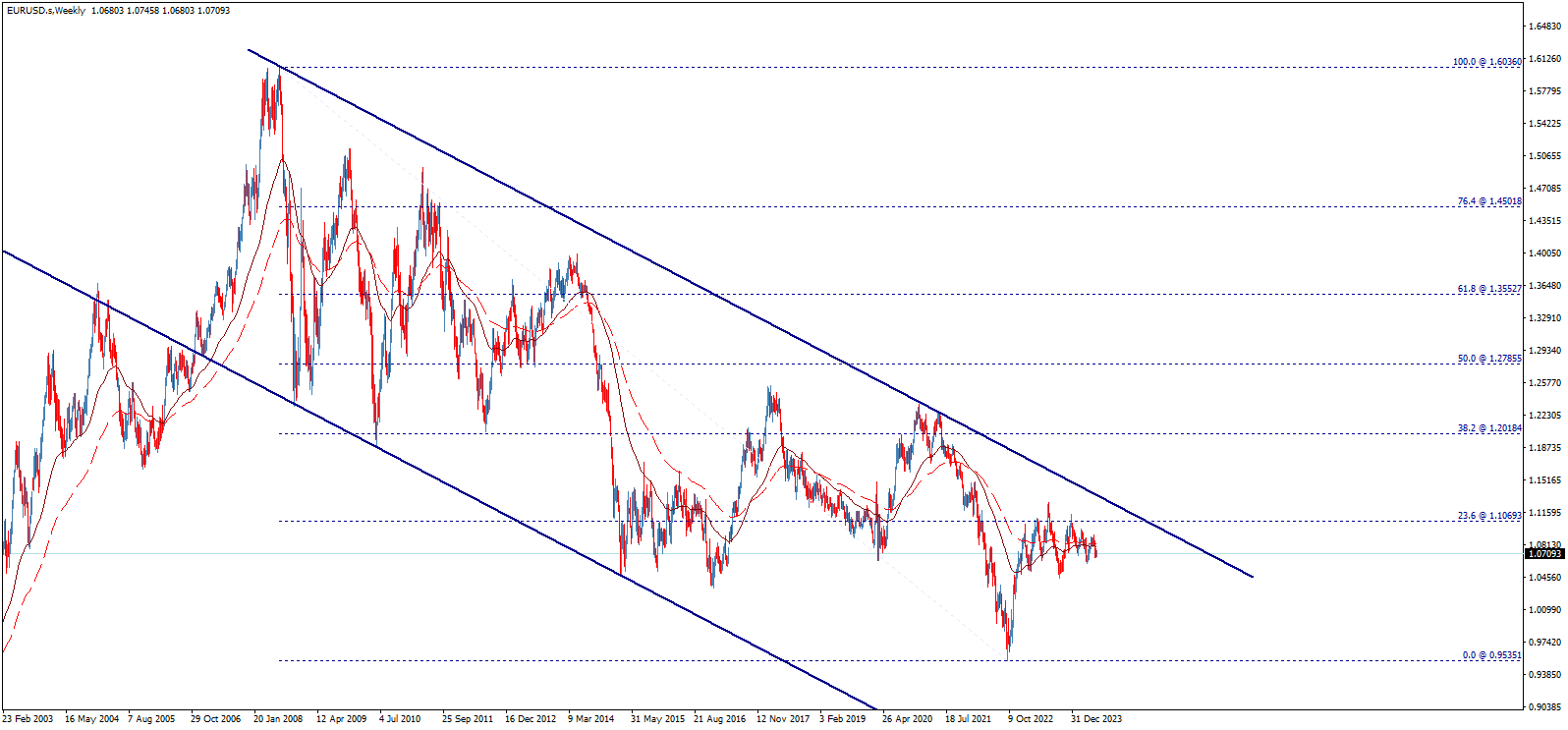 يظهر لنا الرسم البياني الأسبوعي الموجة الهابطة طويلة الأمد التي بدأها سعر اليورو مقابل الدولار من القمة التاريخية التي سجّلها عند 1.6036$ في منتصف العام 2008، لينخفض بشكل قوي ويصل إلى مستوى التعادل تقريباً في منتصف العام 2022، وأجرى محاولات لكسر هذا المستوى لكنه يعود للتعافي ومحاولة تحقيق بعض المكاسب، التي تبقى ضمن مناطق محدودة، حيث يستمر السعر بمواجهة ضغوط سلبية تدفع به للانخفاض.