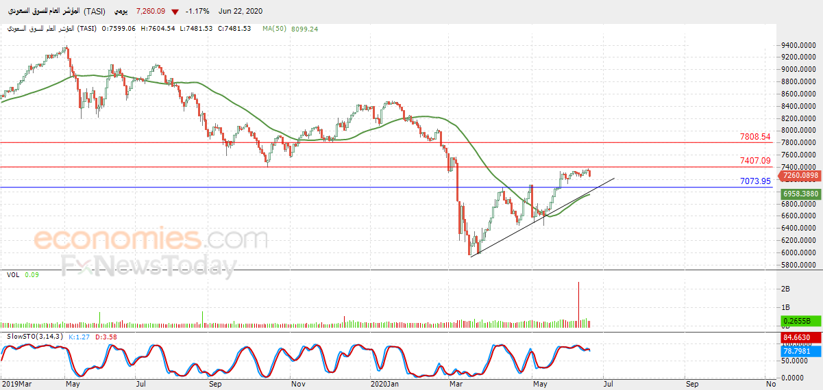 انخفض المؤشر العام للسوق السعودي (TASI) في آخر جلساته، ليسجل خسائر للجلسة الثانية على التوالي بنسبة بلغت -1.17% بما يعادل -85.791 نقطة، وذلك وسط تداولات المؤشر بمحاذاة خط ميل تصحيحي صاعد على المدى القصير، وبضغط إيجابي متواصل لتداولاته أعلى متوسطه المتحرك البسيط لفترة 50 يوماً السابقة، ليحاول المؤشر اكتساب زخماً إيجابياً قد يساعده على الارتفاع من جديد، مع توارد الإشارات السلبية بمؤشرات القوة النسبية.