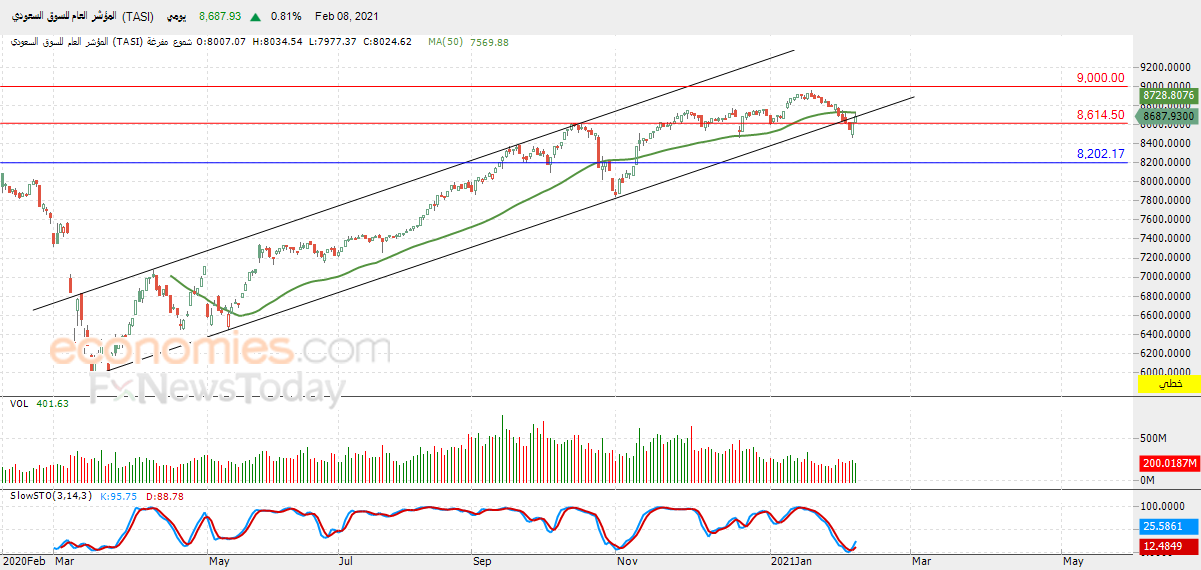 لذلك تقف توقعاتنا على الحياد انتظاراً لسلوك المؤشر القادم حيال مستوى 8,614.50، ففي حالة استقرار المؤشر أعلاه فهذا يعني عزمه على المزيد من الصعود، ليستهدف مستوى المقاومة 9,000.00.