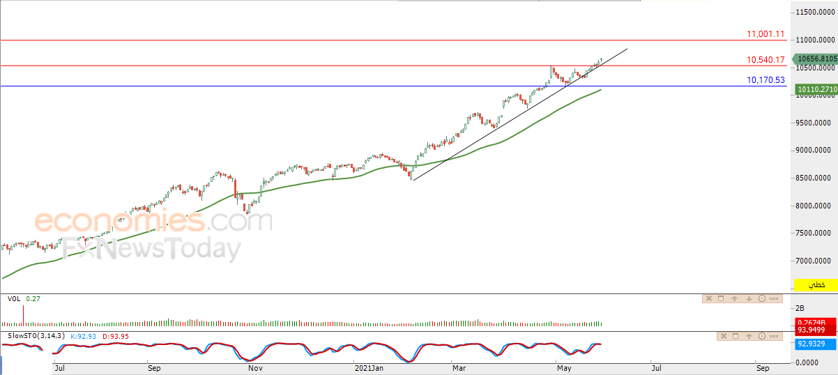 لذلك تظل توقعاتنا بالمزيد من الارتفاع للمؤشر خلال تداولاته القادمة، طيلة استقراره أعلى مستوى 10,540.17، ليستهدف مستوى المقاومة الرئيسي والنفسي 11,000.