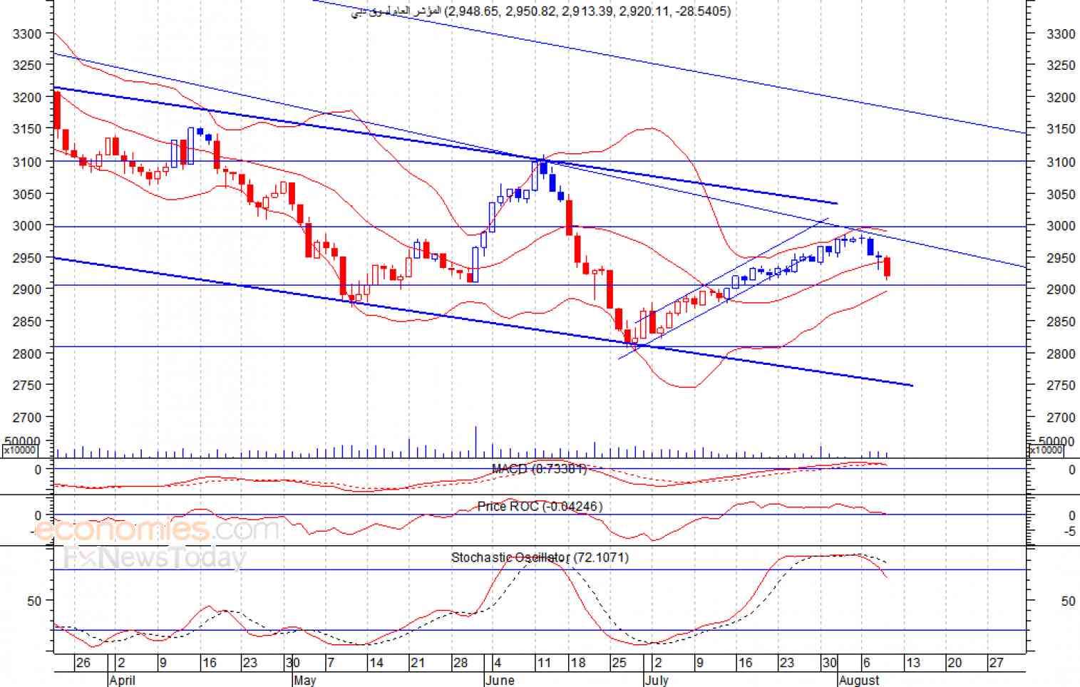 انخفض المؤشر قد أشرنا في تقاريرنا السابقة، حيث انهى تداولات الخميس الماضي منخفضا عند مستوى 2920 نقطة، مخترقا بذلك متوسطه المتحرك لـ 20 يوم، وهو ما يعد إشارة سلبية، كما تعكس المؤشرات الفنية مثل مؤشر ماكد انطلاق إشارة بيع، مما يشير الى ان المؤشر قد يشهد مزيدا من الانخفاض لمستويات قد تصل الى 2800 نقطة، شرط عدم تجاوز المؤشر لمستوى 3000 نقطة.