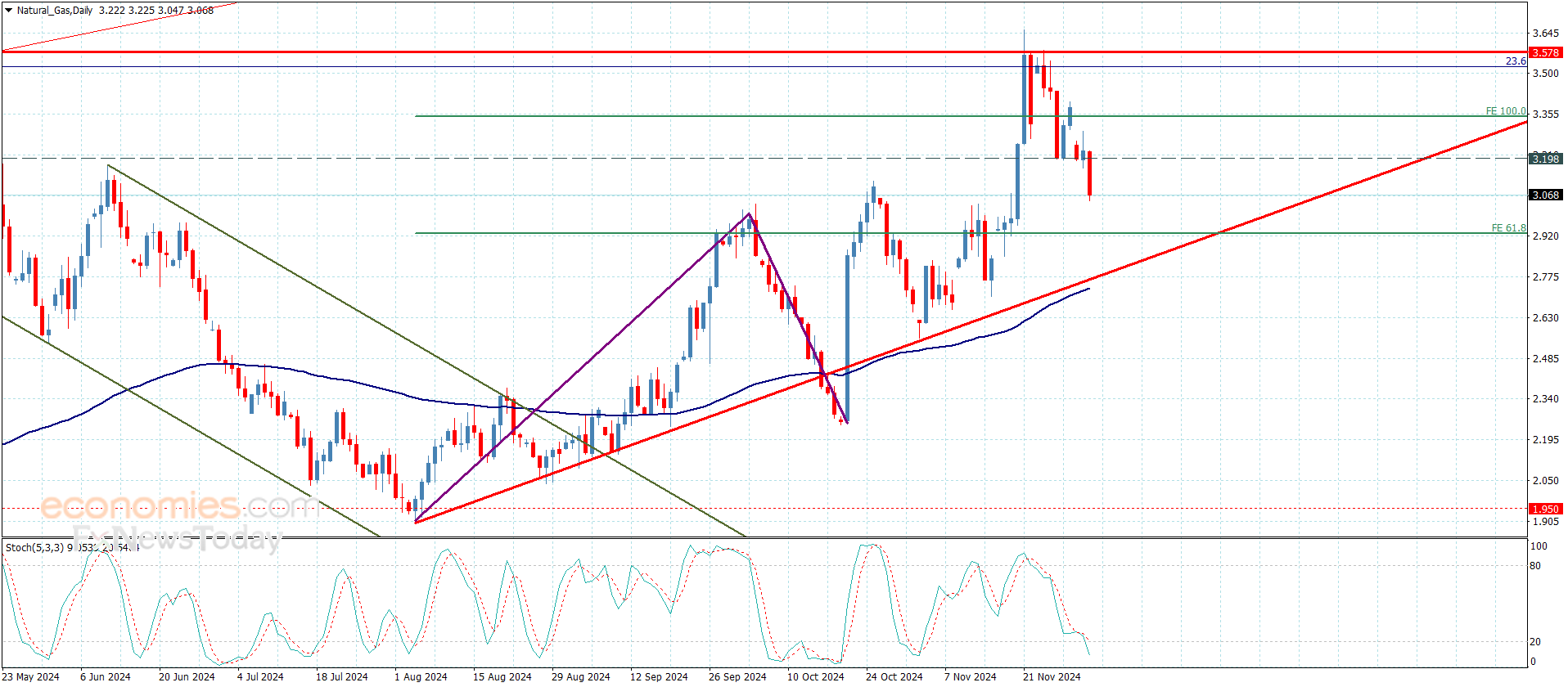 قدّم سعر الغاز إغلاق سلبي جديد دون مستوى 3.190$ مؤكدا استسلامه لسيطرة الميل التصحيحي الهابط المقترح سابقا لنلاحظ تكبده يوم أمس لبعض الخسائر بوصوله نحو 3.040$ وليقترب بذلك من الهدف الأول المنتظر سابقا.