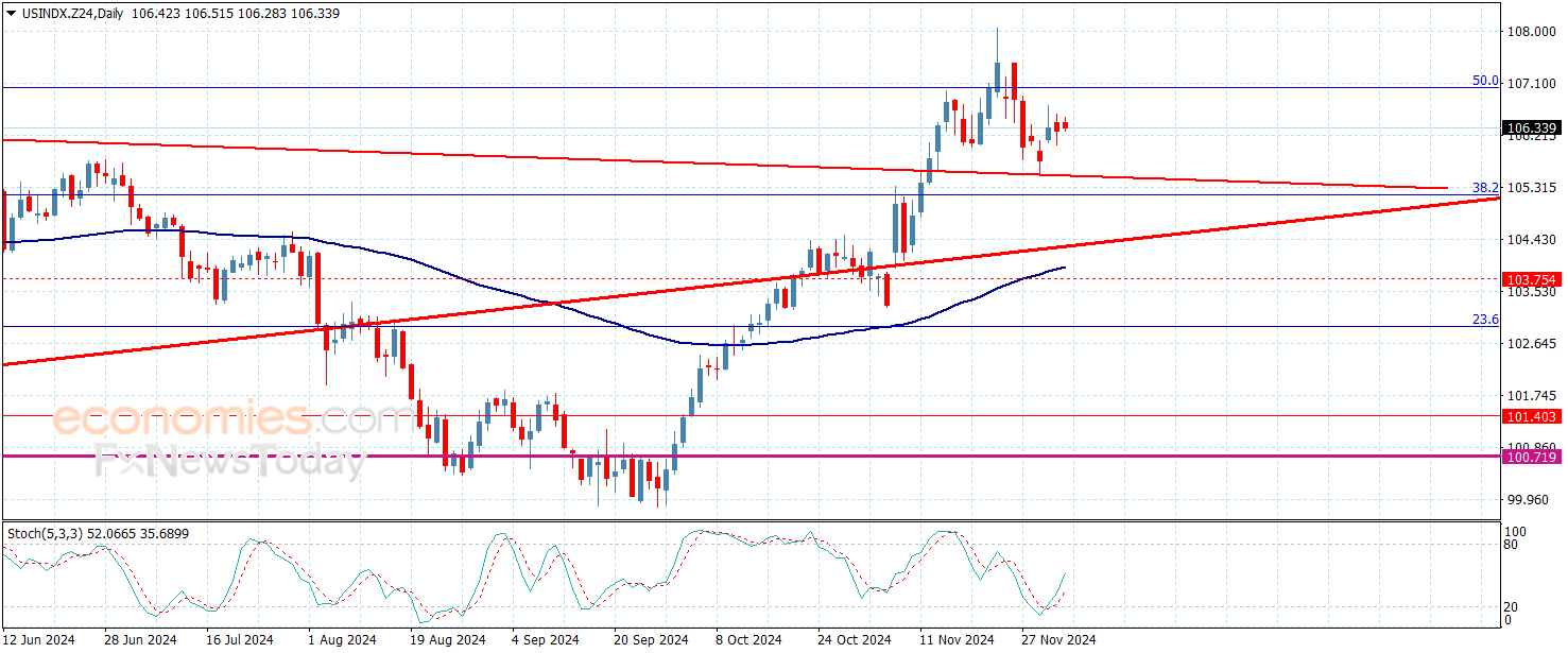 كرر سعر المؤشر تشكيله لتداولات صاعدة مستغلا الثبات ضمن المسار الصاعد والقائم على استمرار تشكيل مستوى 105.60 للدعم الرئيسي لنلاحظ تحقيقه لبعض المكاسب بوصوله نحو 106.50.
