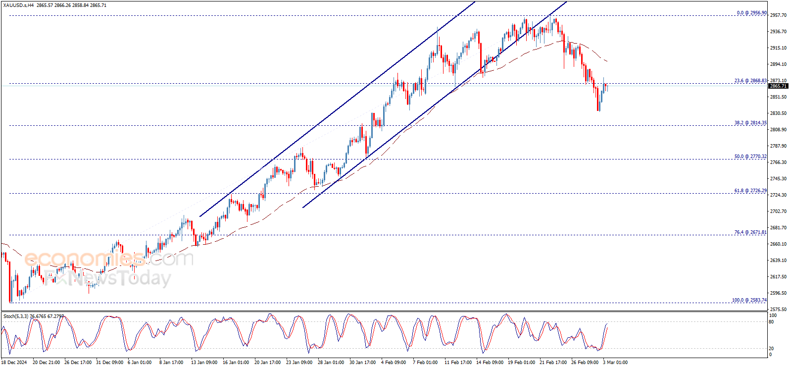 يستمر سعر الذهب بالتذبذب عند مستوى 2868.85$ ويحاول اختراقه، بينما يفقد مؤشر ستوكاستيك عزمه الإيجابي بشكل واضح، ليواجه تعارضاً بين العوامل الفنية يجعلنا نستمر في حياديتنا حتى الآن إلى أن نحصل على إشارة أوضح للاتجاه التالي.