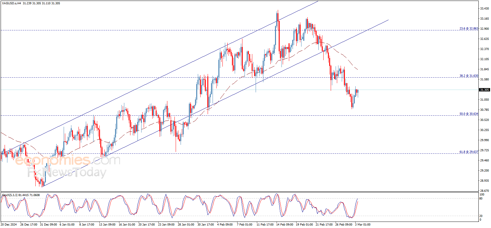 يتذبذب سعر الفضة في مسار جانبي منذ الصباح، ويحاول تقديم تداولات إيجابية للتوجه نحو اختبار محتمل للمقاومة المحورية 31.63$، مع ملاحظة أن مؤشر ستوكاستيك يفقد عزمه الإيجابي بشكل ملحوظ.