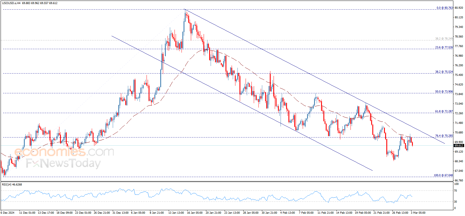 يتداول سعر النفط بسلبية ملحوظة ليبتعد عن مستوى 70.30$ ويعزز التوقعات باستمرار الاتجاه الهابط بقية اليوم، مقترباً من حاجز 69.00$ الآن، بانتظار مزيد من الانخفاض خلال الجلسات القادمة بدعم من المتوسط المتحرك 50.