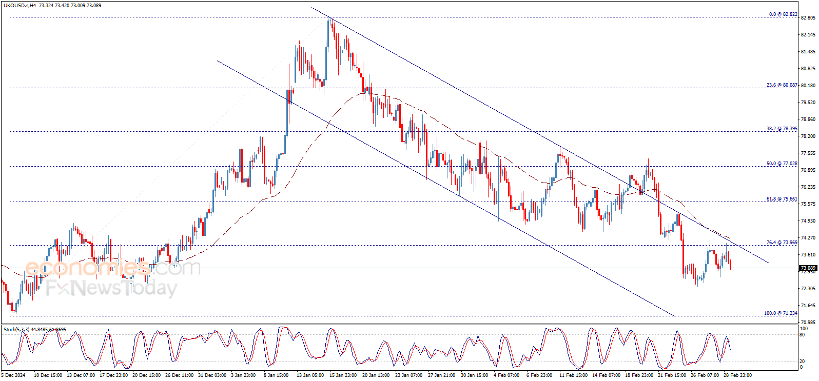 يظهر سعر عقود خام برنت انخفاضاً ملحوظاً ليتجاوز حاجز 73.00$ ويعزز التوقعات باستمرار سيطرة الاتجاه الهابط خلال الجلسات القادمة، ليصل إلى هدفنا الأول المنتظر عند 72.70$، ونرجّح استمرار الانخفاض لتحقيق أهداف سلبية إضافية تصل إلى 71.25$.