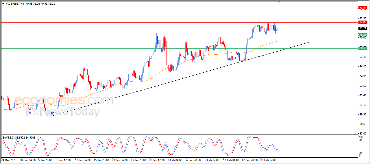 يتحرك سعر النفط خام برنت (BRENT) باتجاه عرضي على مستوياته اللحظية الأخيرة، ليحاول اكتساب زخماً إيجابياً قد يساعده على التعافي واستئناف مكاسبه من جديد، في ظل استمرار الدعم الديناميكي المتمثل في تداولاته اعلى متوسطه المتحرك البسيط لفترة 50، والذي يعزز من استقرار وهيمنة الاتجاه الرئيسي الصاعد على المدى القصير، بالإضافة إلى ذلك نلاحظ بدء ظهور تقاطع إيجابي بمؤشرات القوة النسبية، بعد وصولها لمناطق شديدة التشبع بعمليات البيع.