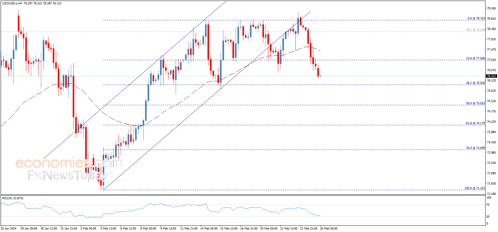 أنهى سعر النفط تداولات يوم الجمعة الماضي دون مستوى 77.00، ليدعم التوقعات باستمرار سيطرة التصحيح الهابط على المدى اللحظي، ويقترب من الهدف الثاني المنتظر عند 75.93، ويبدو المجال مفتوحاً أمام تخطّي هذا المستوى لتحقيق أهداف سلبية إضافية تصل إلى 75.05 ثم 74.20.