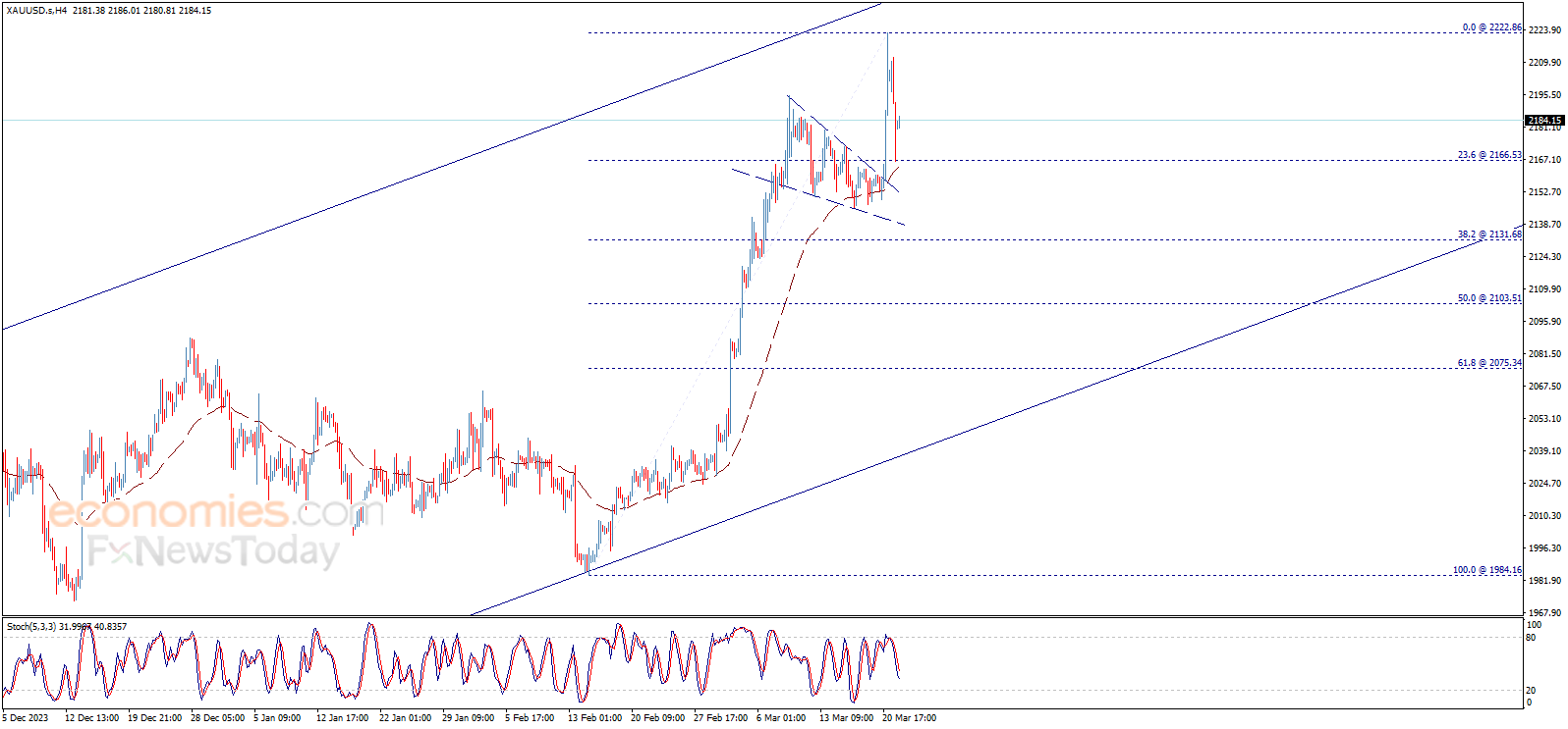 توقّف انخفاض سعر الذهب تماماً عند مستوى 2166.30$، حيث أجرى تصحيح هابط للارتفاع الذي تم قياسه من 1984.16$ إلى 2222.86$، ليرتد صعوداً ويقدّم إشارات على التوجه لاستئناف الاتجاه الرئيسي الصاعد، في طريقه لاختبار مستويات 2222.86$ ثم 2239.00$ كمحطات رئيسية تالية.
