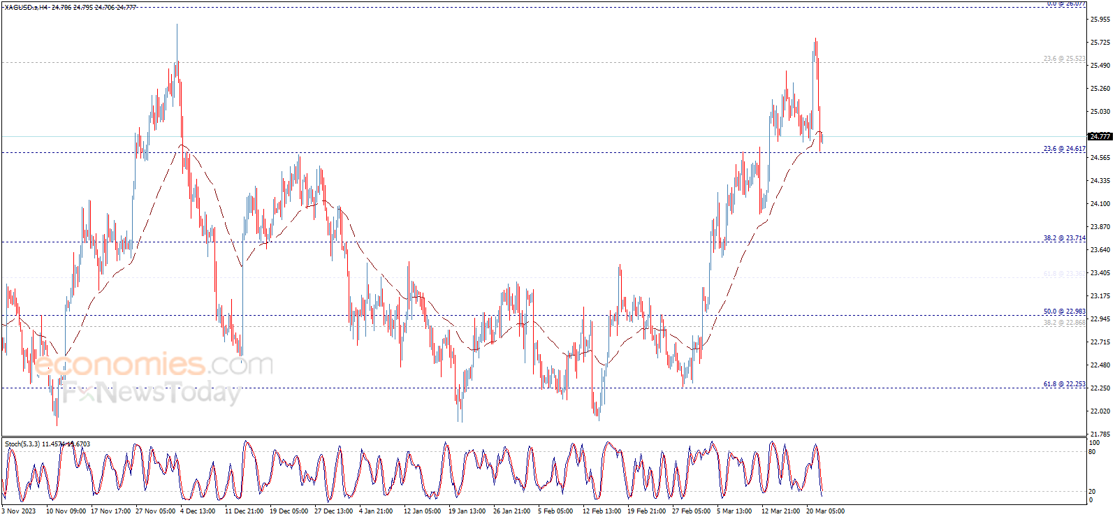 من هنا، فإننا نرجّح أن نشهد تداولات إيجابية خلال الجلسات القادمة، مع الانتباه إلى أن كسر 24.60$ سيضغط على السعر لتكبّد خسائر إضافية تصل إلى مستويات 24.00$ ثم 23.70$.