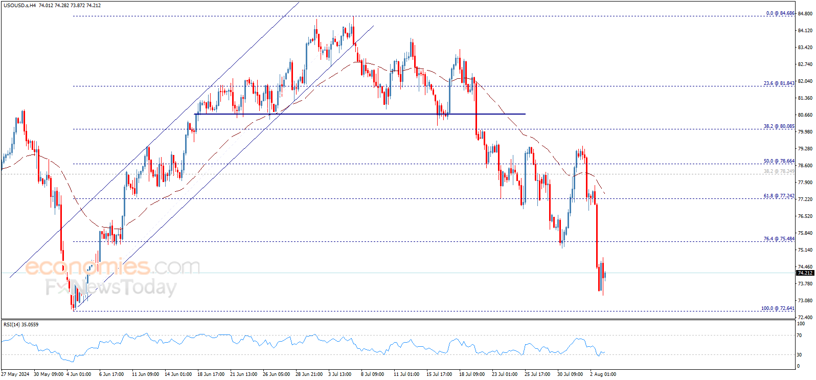 تستقر تداولات سعر النفط حول حاجز 74.00$ دولار بعد الانخفاض القوي الذي شهده في الجلسات الماضية، بانتظار استئناف التداولات السلبية لزيارة مستوى 72.64$ الذي يمثّل هدفنا الرئيسي التالي، ليبقى سيناريو الاتجاه الهابط مرجحاً على المدى اللحظي والقصير.