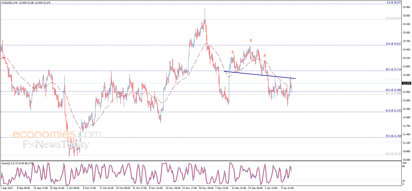 نشير إلى أن كسر الدعم المذكور سيضغط على السعر لاستئناف الموجة الهابطة التي تستهدف مناطق 22.25 كمحطة رئيسية تالية، بينما يمثّل اختراق المقاومة عامل إيجابي سيقود السعر للتعافي وبناء موجة صاعدة يتواجد هدفها الرئيسي الأول عند 24.60.
