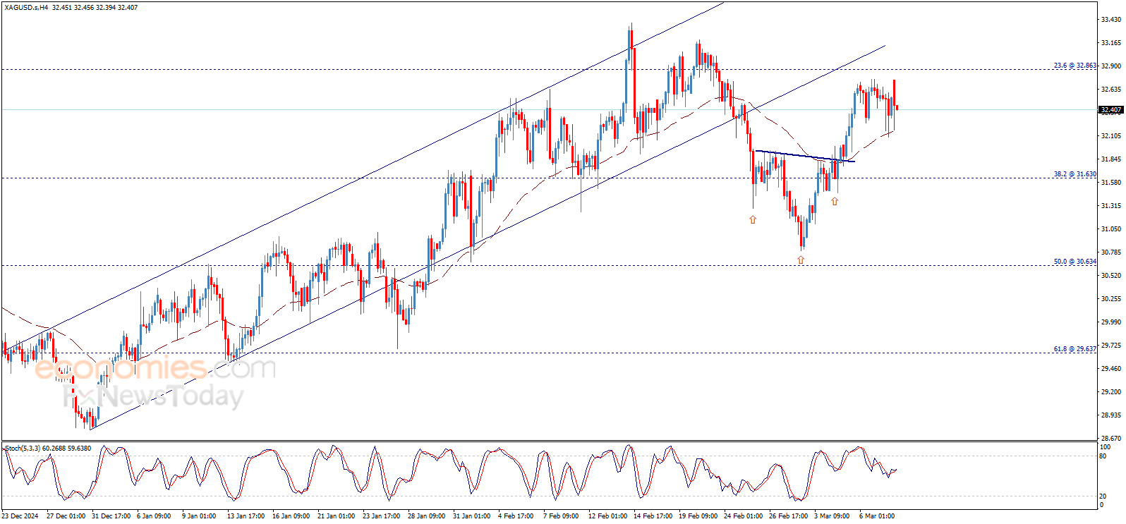 افتتح سعر الفضة تداولات اليوم بارتفاع ملحوظ ليقترب من هدفنا الإيجابي المنتظر عند 32.86$، ويظهر بعض الميل الهابط ليتذبذب حول 32.40$ الآن، بانتظار الحصول على حافز إيجابي يساهم بدفع السعر للارتفاع من جديد وملامسة الهدف المذكور كمحطة إيجابية أولى، متأثراً بنموذج الرأس والكتفين المقلوب المكتمل مسبقاً.