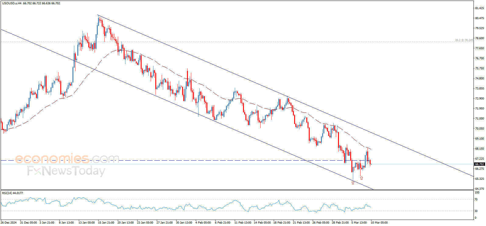 توقّف ارتفاع سعر النفط عند المتوسط المتحرك 50 الذي شكّل مقاومة قوية حول 68.20$، ليجبر السعر على الارتداد هبوطاً والتحرّك دون 67.05$ من جديد، مما يوقف السيناريو الإيجابي المقترح في تقريرنا الأخير ويدفع السعر لاستئناف الاتجاه الرئيسي الهابط ضمن القناة الهابطة التي تظهر بالرسم البياني.