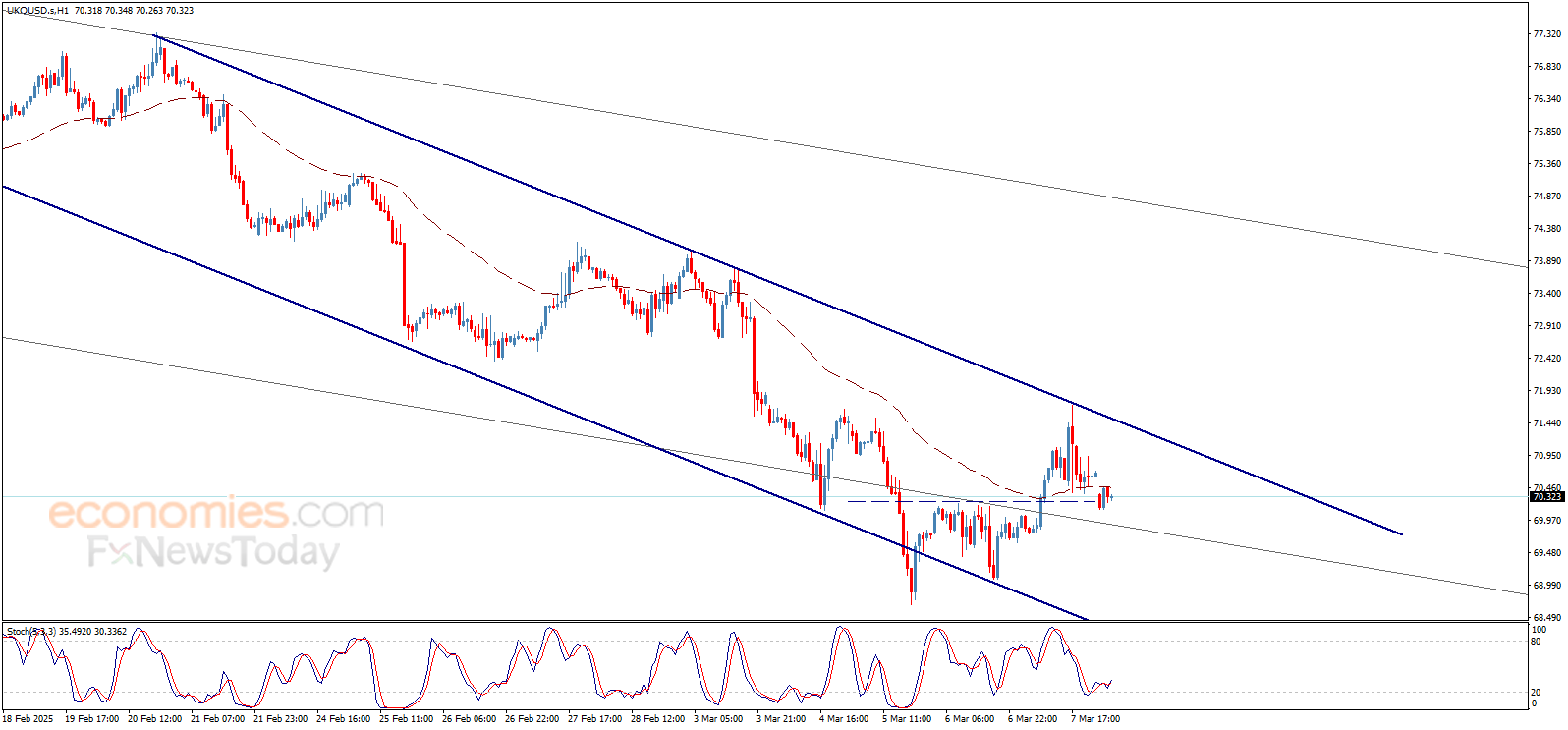 واصل سعر عقود خام برنت الارتفاع لينجح بملامسة مقاومة القناة الهابطة التي انخفضت إلى 71.70$، ليرتد هبوطاً بشكل ملحوظ من هناك ويتجه نحو استئناف المسار الرئيسي الهابط ضمن القناة المذكورة، ويحتاج السعر لتجاوز مستوى 70.10$ لتعزيز فرص استمرار الميل الهابط خلال الجلسات القادمة.
