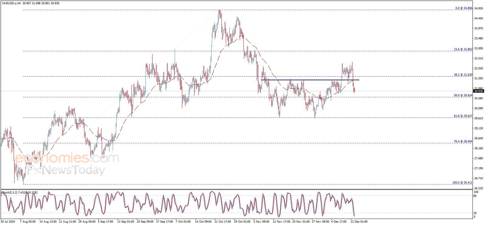 من هنا، فإن الميل الهابط سيكون مرجحاً لهذا اليوم، مع الانتباه إلى أن اختراق 31.63$ سيوقف الانخفاض المتوقع ويقود السعر للتعافي من جديد، ليبني موجة صاعدة تستهدف مستوى 32.86$ مبدئياً.