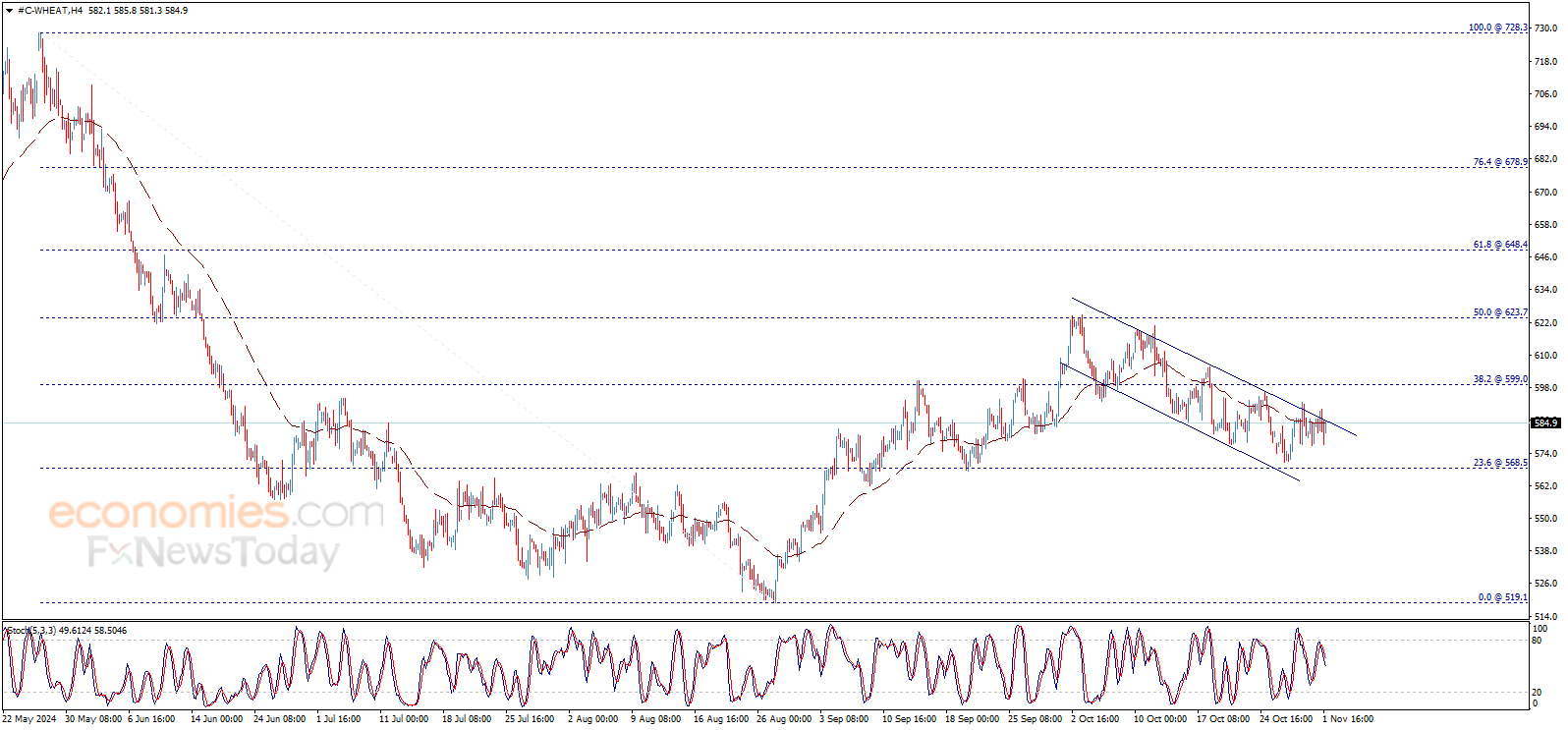 يتذبذب سعر القمح حول المتوسط المتحرك 50، ولا يزال مستقراً داخل القناة الهابطة، بالتزامن مع ظهور إشارات سلبية من خلال مؤشر ستوكاستيك الآن، وبالتالي، نحن نتوقّع أن يستأنف السعر الاتجاه الهابط خلال الجلسات القادمة، والذي تبدأ أهدافه عند 568.50$ وتمتد إلى 555.60$ بعد كسر المستوى السابق، مع التذكير بأن استمرار الموجة الهابطة يعتمد على الثبات دون مستوى 599.00$.