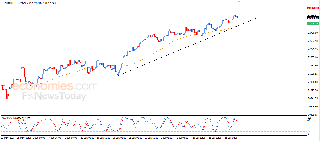 لذلك تشير توقعاتنا إلى صعود مؤشر ناسداك 100 بتداولاته القادمة على المستويات اللحظية، طيلة ثبات الدعم الرئيسي 23,000، ليستهدف مستوى المقاومة 23,450.