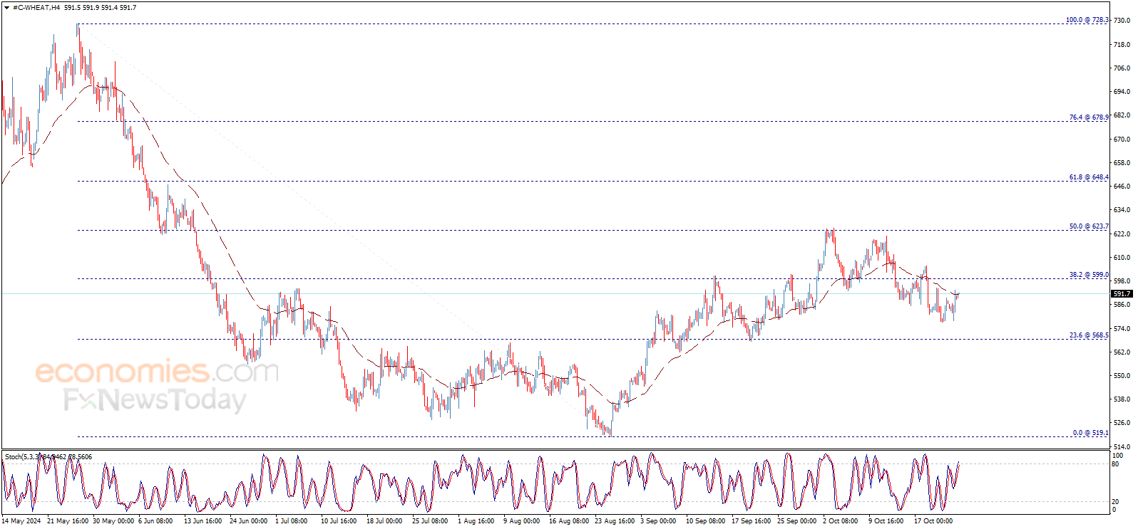 يستمر سعر القمح بالتذبذب حول المتوسط المتحرك 50، بينما يفقد مؤشر ستوكاستيك عزمه الإيجابي من جديد، بانتظار تحفيز السعر على استئناف الاتجاه الهابط المتوقع على المدى اللحظي، والذي يتواجد هدفه التالي عند 568.50$.