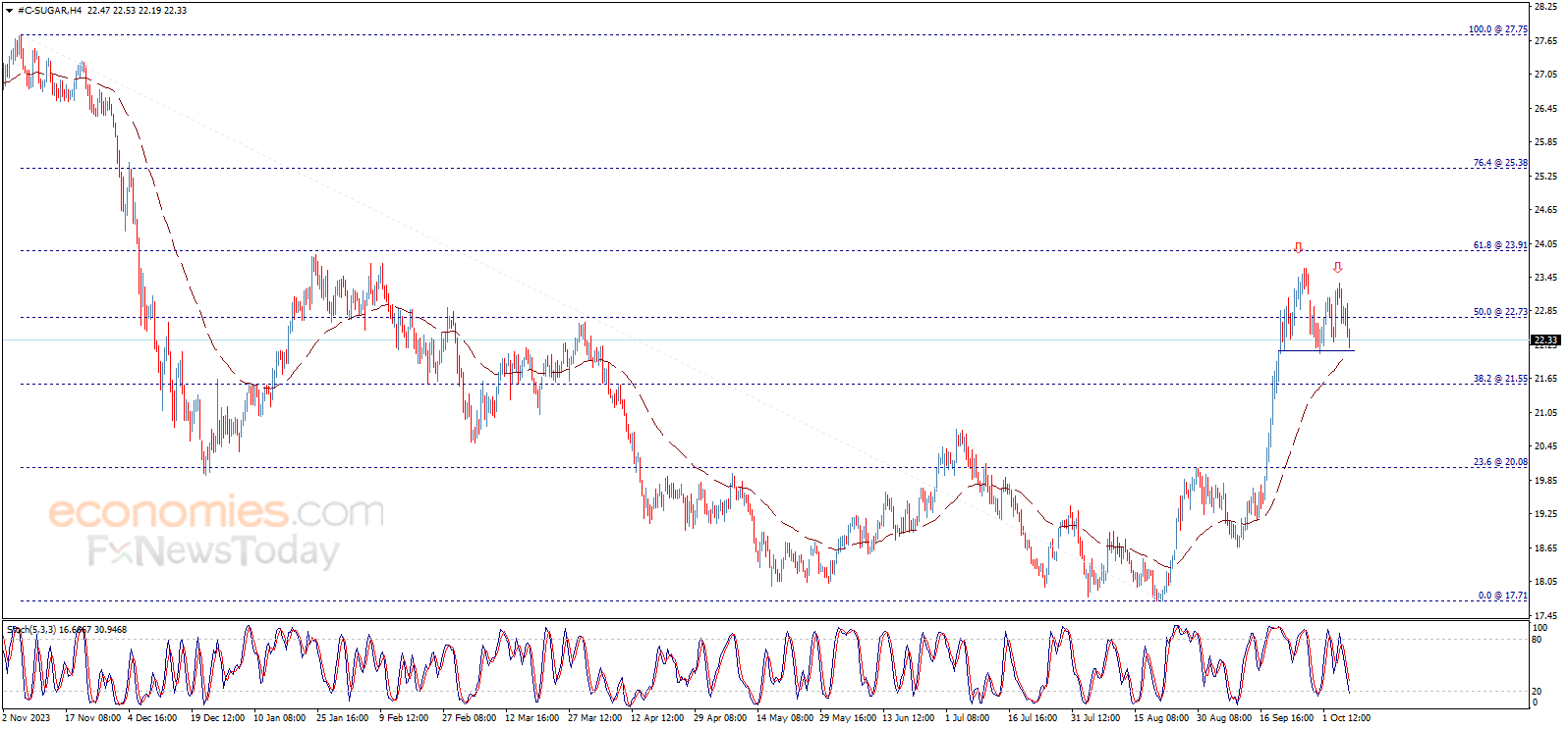 أنهى سعر السكر تداولات يوم أمس بسلبية ملحوظة، حيث كسر مستوى 22.73$ واستقر دونه، وبتدقيق النظر في الرسم البياني، نجد بأن السعر يشكل نموذج قمة مزدوجة نتوقّع أن يدفع السعر لتكبّد خسائر خلال الجلسات القادمة، مستهدفاً مستويات 21.55$ ثم 20.80$ كمحطات سلبية تالية.