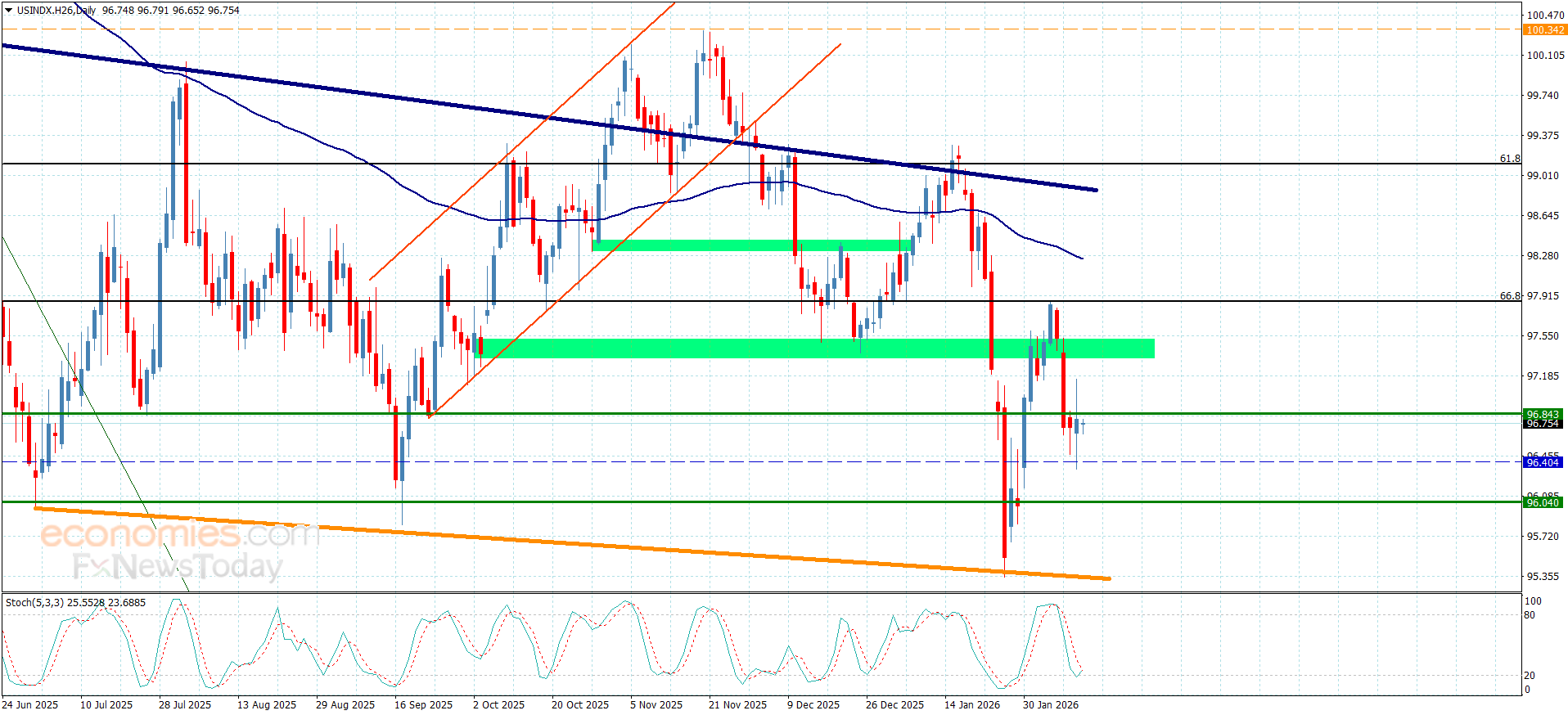 نجح سعر المؤشر بالتخلص بشكل مؤقت من الضغوط السلبية مستندا بذلك فوق الدعم الإضافي المتمركز قرب 96.40 لنلاحظ بدء تشكيله حاليا لموجات صاعدة واستقراره قرب 96.85.