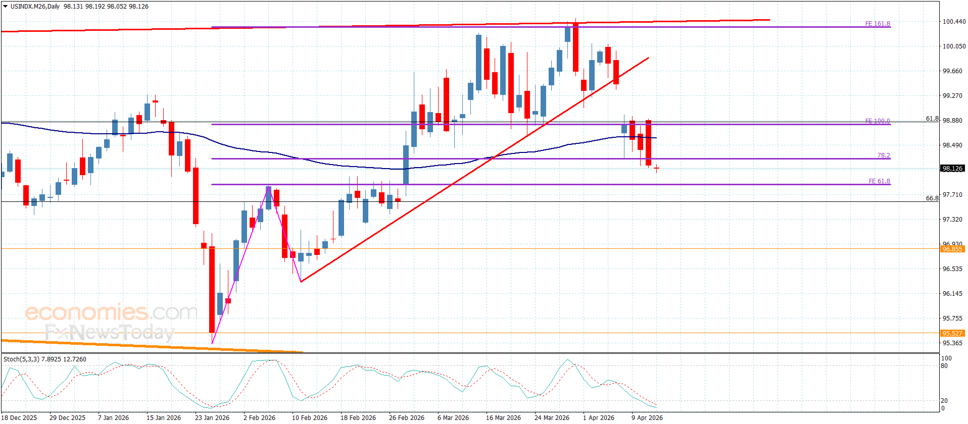 تعرض سعر المؤشر لضغوط سلبية قوية منذ تداولات يوم أمس ليجبره ذلك على تقديم تداولات هابطة جديدة ليستقر من خلالها دون الدعم الإضافي المتمركز عند 98.20 لنلاحظ تكبده حاليا لخسائر إضافية بتسلله نحو 98.05.