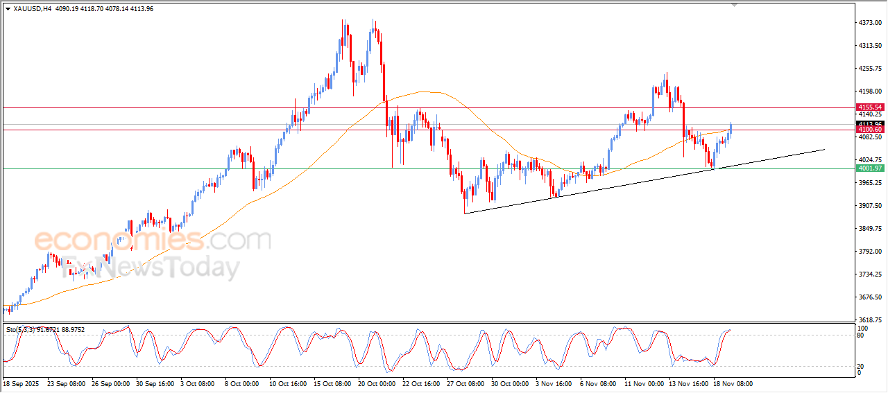 مدد سعر الذهب (GOLD) من مكاسبه خلال تداولاته اللحظية الأخيرة، لينجح بتخطي مقاومة متوسطه المتحرك البسيط لفترة 50، وليستقر أعلى المقاومة الرئيسية 4,100$، مدفوعاً بتحركاته بمحاذاة خط اتجاه فرعي صاعد على المدى القصير، مع توارد الإشارات الإيجابية بمؤشرات القوة النسبية، ولكن نلاحظ وصولها لمناطق شديدة التشبع بعمليات الشراء، ما قد يكبح من مكاسب السعر القادمة.