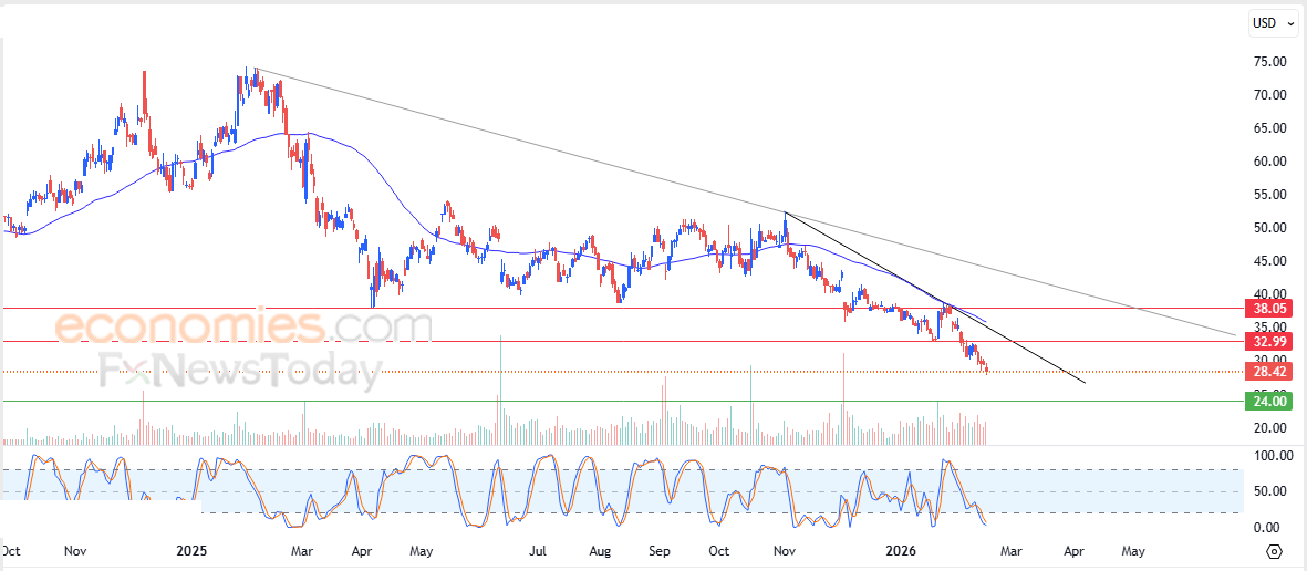 لذلك فتوقعاتنا تشير إلى هبوط سعر السهم خلال تداولاته القادمة، طيلة استقراره دون المقاومة 33.00$، ليستهدف مستوى الدعم التالي له عند سعر 24.00$.