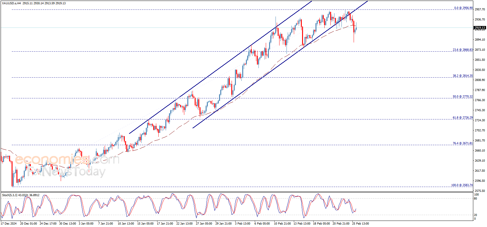 واجه سعر الذهب ضغوط سلبية إضافية ليؤكد كسر دعم القناة الصاعدة، ليتجه نحو إجراء تصحيح هابط على المدى اللحظي، مستهدفاً اختبار مستوى 2868.80$ كمحطة سلبية تالية، والذي يمثّل مستوى 23.6% فيبوناتشي للارتفاع الذي تم قياسه من 2583.75$ إلى 2956.90$.