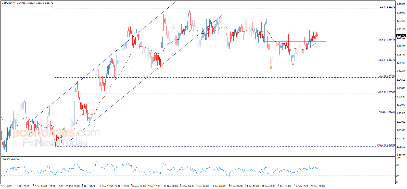 المتوسط المتحرك 50 يستمر بدعم السعر من الأسفل، ليبقى سيناريو الاتجاه الصاعد قائماً وفعالاً للفترة القادمة، مع التذكير بأن كسر 1.2650 سيوقف الارتفاع المتوقع ويضع السعر تحت الضغط التصحيحي الهابط من جديد.
