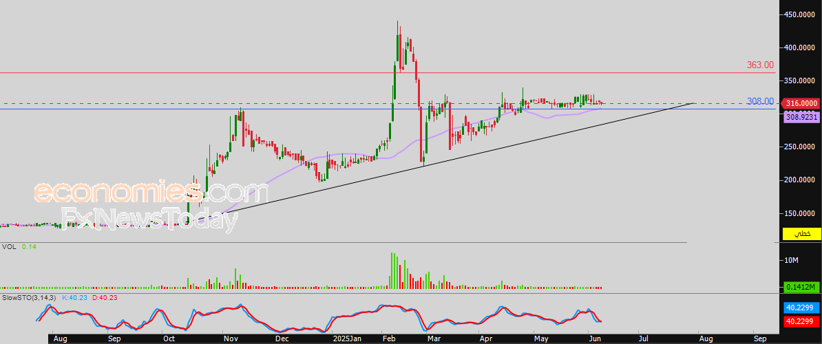 لذلك تشير توقعاتنا إلى ارتفاع سعر السهم خلال تداولاته القادمة، بشرط ثبات مستوى الدعم 308.00 دينار، ليستهدف مستوى المقاومة 363.00 دينار.