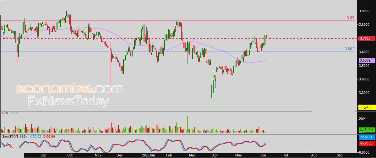 لذلك تشير توقعاتنا إلى ارتفاع سعر السهم خلال تداولاته القادمة، طيلة ثبات مستوى الدعم 3.602 ريال، ليستهدف مستوى المقاومة المحوري 3.83 ريال.