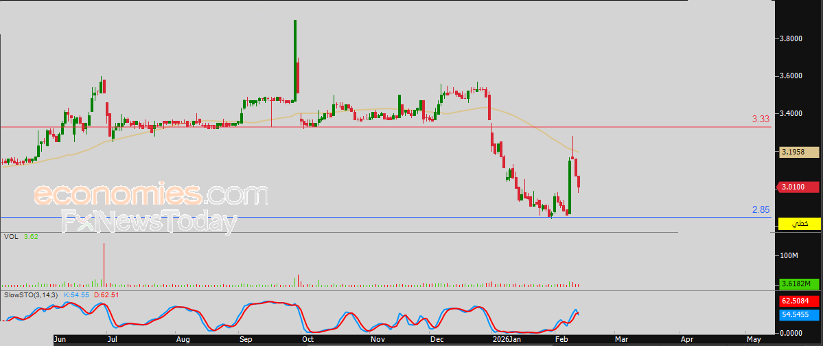 لذلك تشير توقعاتنا إلى انخفاض سعر السهم خلال تداولاته اللحظية القادمة، طيلة ثبات مستوى المقاومة المحوري 3.30 درهم، ليستهدف مستوى الدعم المحوري 2.85 درهم.