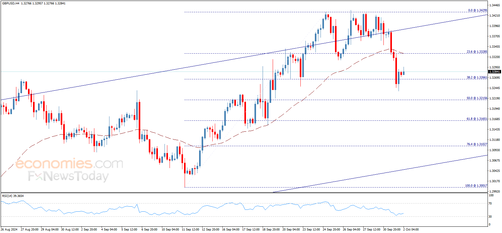 واصل سعر الجنيه الإسترليني مقابل الدولار الانخفاض ليلامس الهدف السلبي الأول عند 1.3266$، والذي يمثّل مستوى تصحيح فيبوناتشي 38.2% للارتفاع من 1.3000$ إلى 1.3429$، ونلاحظ أن السعر تماسك فوق هذا المستوى، ويحصل على إشارات إيجابية من خلال مؤشر القوة النسبية.