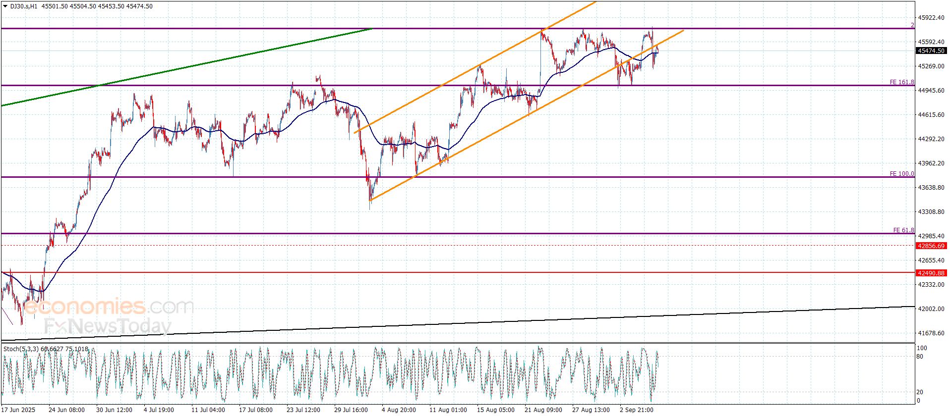 نتوقع تأثر السعر مجددا بسيطرة الميل التصحيحي الهابط بثباته المتكرر دون المقاومة المذكورة سابقا بالإضافة لمحاولة تقديم مؤشر ستوكاستيك للعزم السلبي بخروجه من مستوى تشبع الشراء ليستهدف مجددا مستوى 45250 ومن ثم ليحاول اختبار الدعم التالي المتمركز عند 44980.
