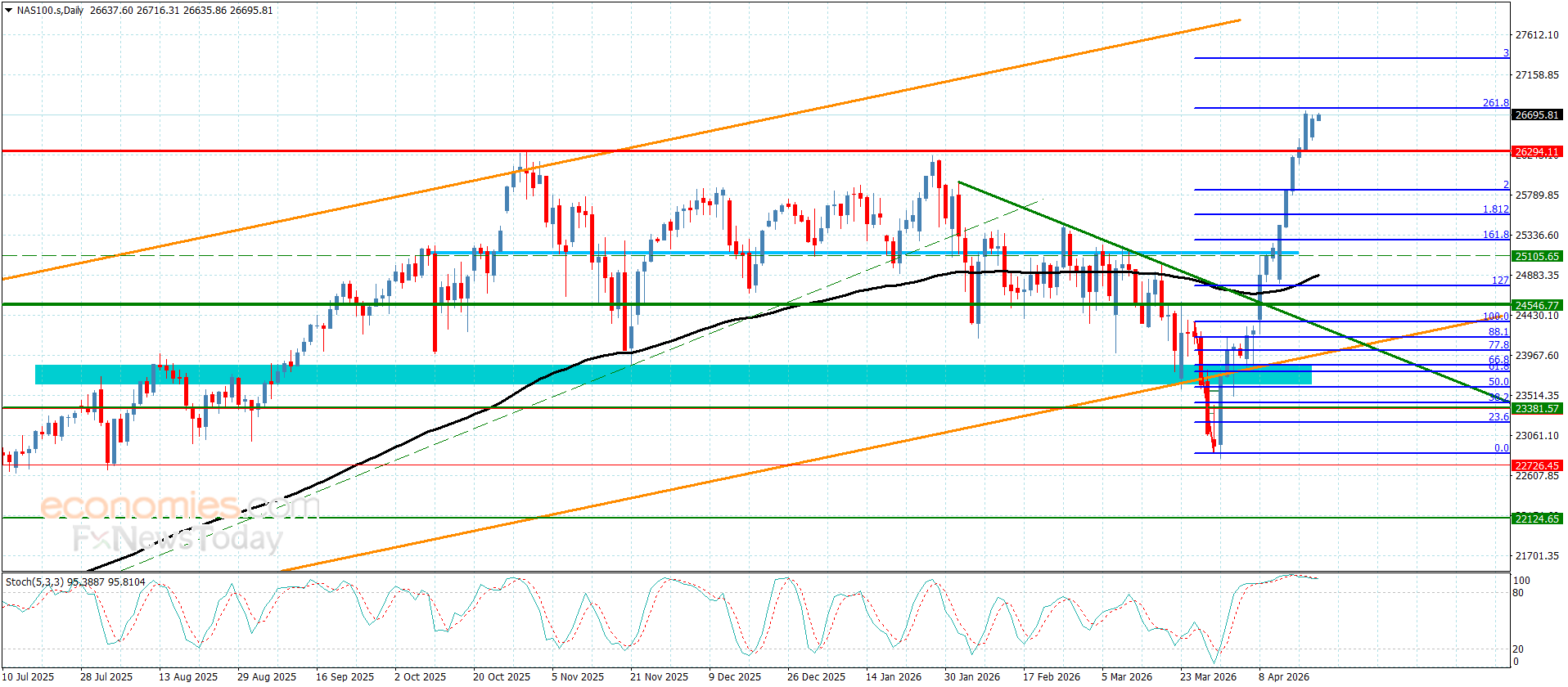 جدد سعر المؤشر المحاولات الصاعدة بتمركزه مؤخرا فوق الدعم الأولي المتمثل بمستوى 26295.00 لنلاحظ اقترابه حاليا من القمة المحققة مؤخرا والمتمثلة بمستوى 26750.00.