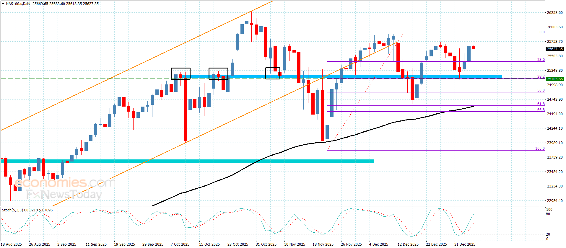 شكّل سعر المؤشر بتداولات يوم أمس اندفاع إيجابي جديد ليقترب من الهدف الأول المستقر عند 25680.00 بفارق قليل ومن ثم ليشكل بعض التداولات الجانبية ليحافظ بذلك على استقراره الإيجابي فوق مستوى الدعم المتمركز عند 25400.00.