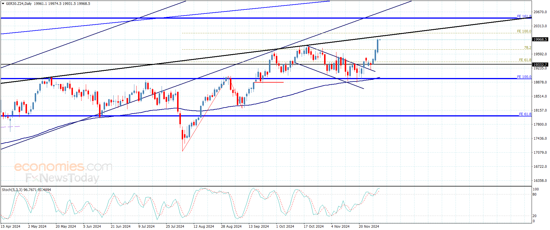 واصل سعر المؤشر تشكيله لموجات صاعدة قوية مستغلا العوامل الإيجابية المتمثلة بتشكيل مستوى 19710.00 للدعم الإضافي وباتحاد تقديم المؤشرات الرئيسية للعزم الإيجابي لنلاحظ اقترابه حاليا من الحاجز النفسي المتمركز عند 20000.00.