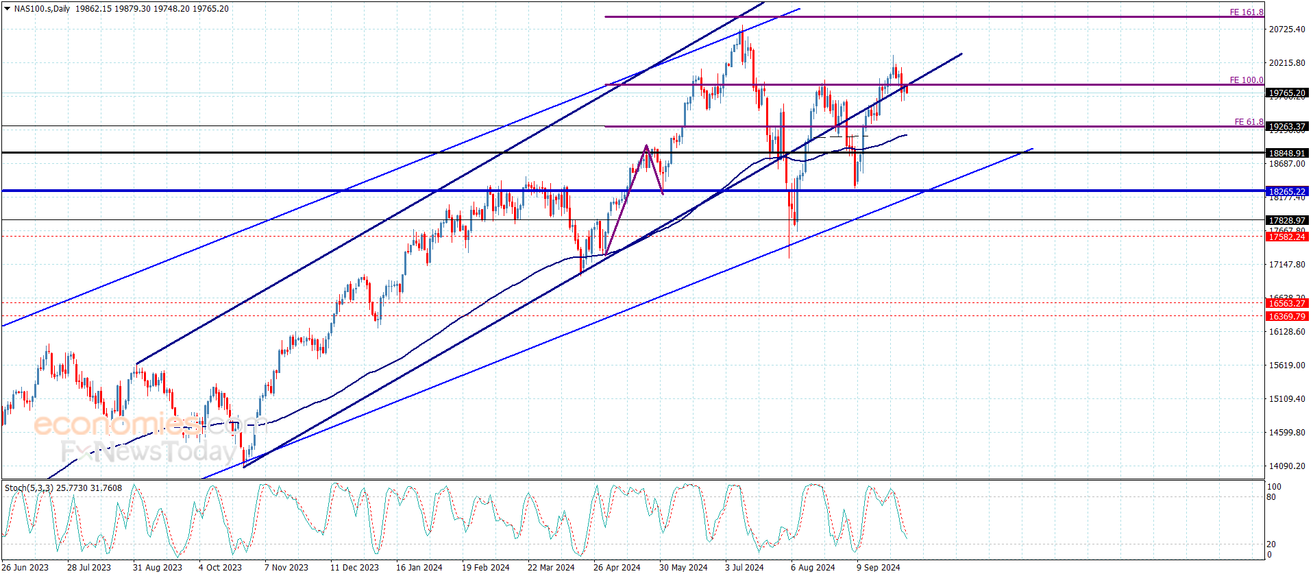 شكّل سعر المؤشر يوم أمس موجه صاعدة مؤقتة ليختبر بذلك مستوى 19900.00 والذي يشكل بدوره حاليا مقاومة قوية ومن ثم ليبدأ بتشكيل التداولات السلبية بتسلله حاليا نحو 19750.00.