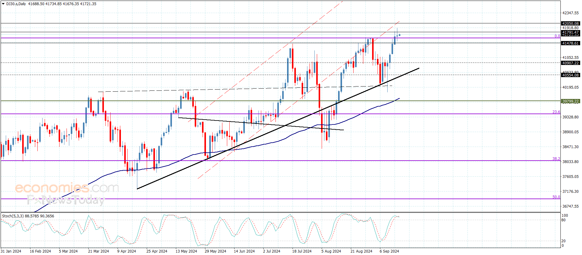 أكد سعر المؤشر تمسكه بالمسار الصاعد بتحقيقه يوم أمس لهدف تاريخي جديد عند 41902 ومن ثم ليستقر بشكل جانبي قرب 41700 بهدف تجميع العزم الإيجابي الإضافي والمطلوب لاستئناف الارتفاع خلال الفترة القريبة والمتوسطة.