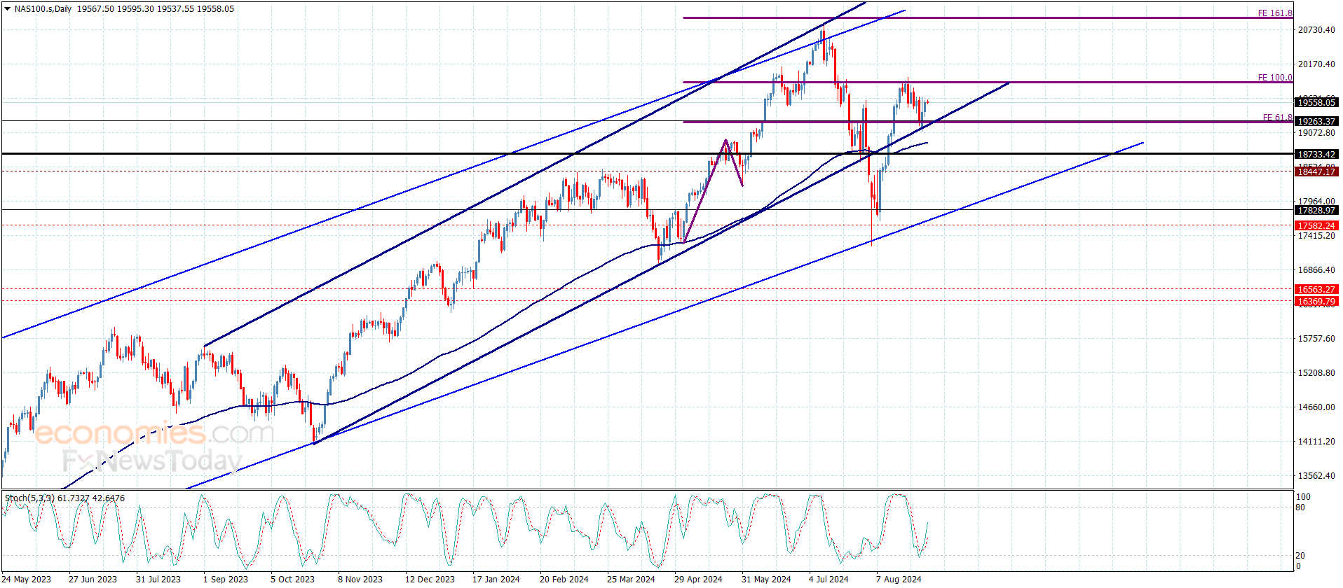 شكّل سعر المؤشر بعض التداولات الجانبية ليحافظ بذلك على تمركزه ضمن محاور القناة الصاعدة مستغلا ثبات الدعم الإضافي الممتد نحو 19155.00 لنلاحظ تمركزه حاليا عند 19550.00.
