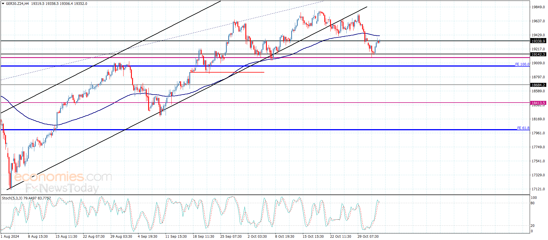 نجح سعر المؤشر بالتخلص من الضغوط السلبية بثباته مؤخرا فوق الدعم الإضافي المتمركز عند 19050.00 لنلاحظ تفعيله للمسار الصاعد بمحاولة تجاوزه للعائق المستقر عند 19325.00 والذي شكّل مؤخرا الهدف الإيجابي الأول للمسار الصاعد.