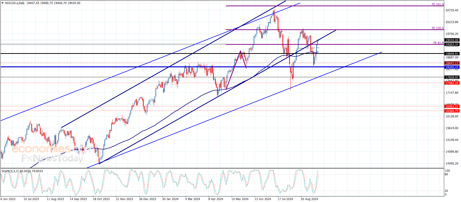 استغل سعر المؤشر ثباته الإيجابي فوق مستوى 19080.00 والذي شكّل بدوره دعم إضافي قوي أمام التداولات الصاعدة لنلاحظ تحقيقه بذلك لمكاسب ملموسة باقترابه من الهدف الرئيسي الأول المتمركز عند 19490.00.