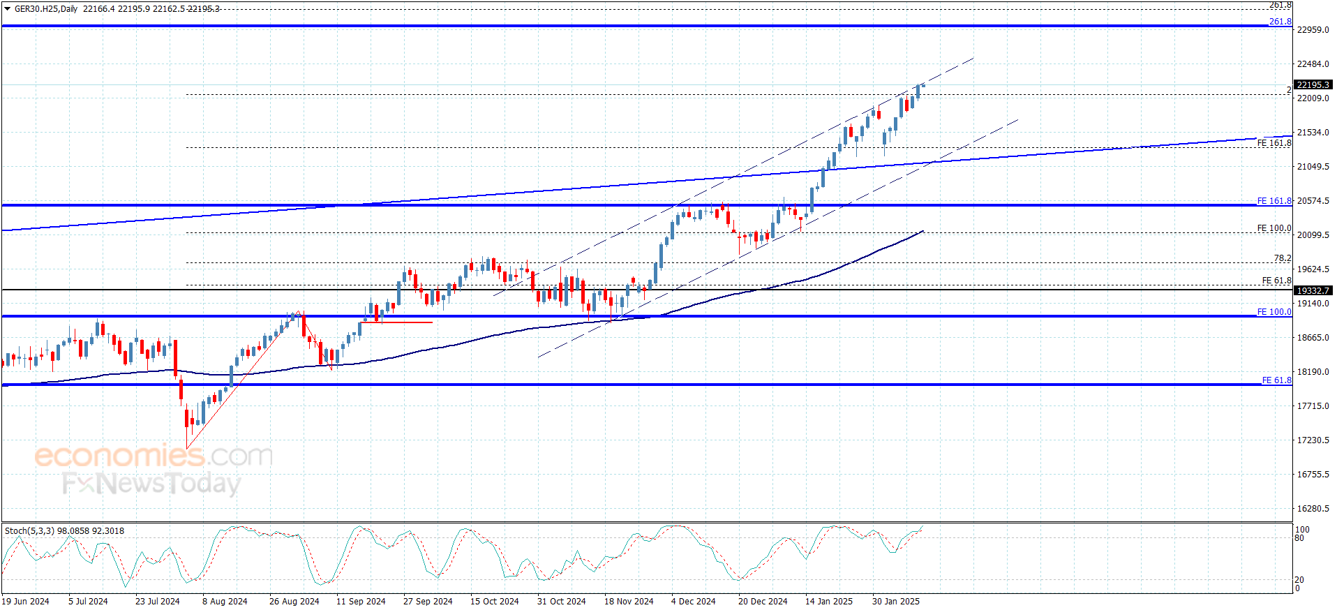 جدد سعر المؤشر بتداولات يوم أمس الاندفاع الصاعد ليسجل قمة تاريخية جديدة بوصوله لمقاومة القناة الصاعدة الممتدة نحو 22200.00 وليستقر قربها.