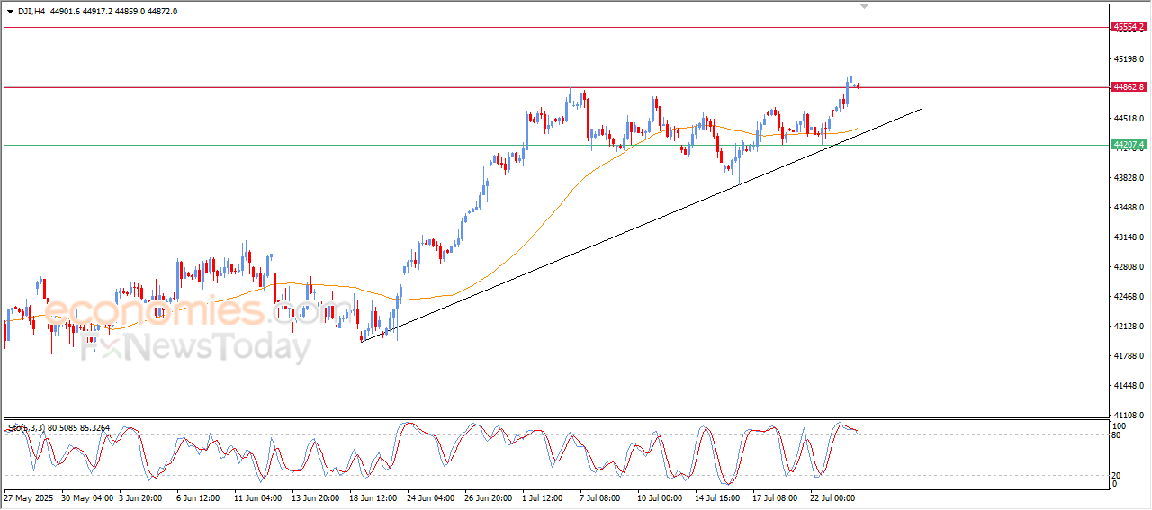 ولهذا فتوقعاتنا تشير إلى صعود مؤشر داو جونز خلال تداولاته اللحظية القادمة، خاصة في حالة تأكيد اختراقه للمقاومة المذكورة 44,860، ليستهدف مستوى المقاومة التالي له عند مستوى 45,550.