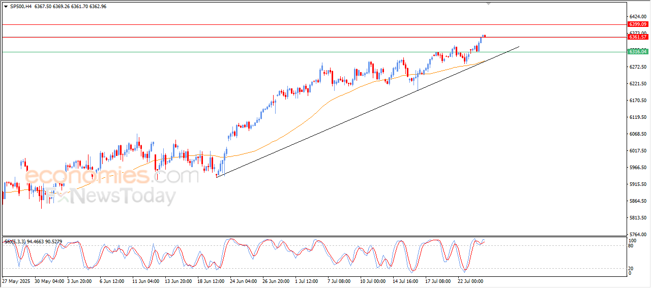 لذلك تشير توقعاتنا إلى صعود مؤشر ستاندر آند بورز 500 بتداولاته القادمة على المستويات اللحظية، خاصة في حالة اختراقه للمقاومة المذكورة 6,360، ليستهدف مقاومته التالية عند مستوى 6,400.