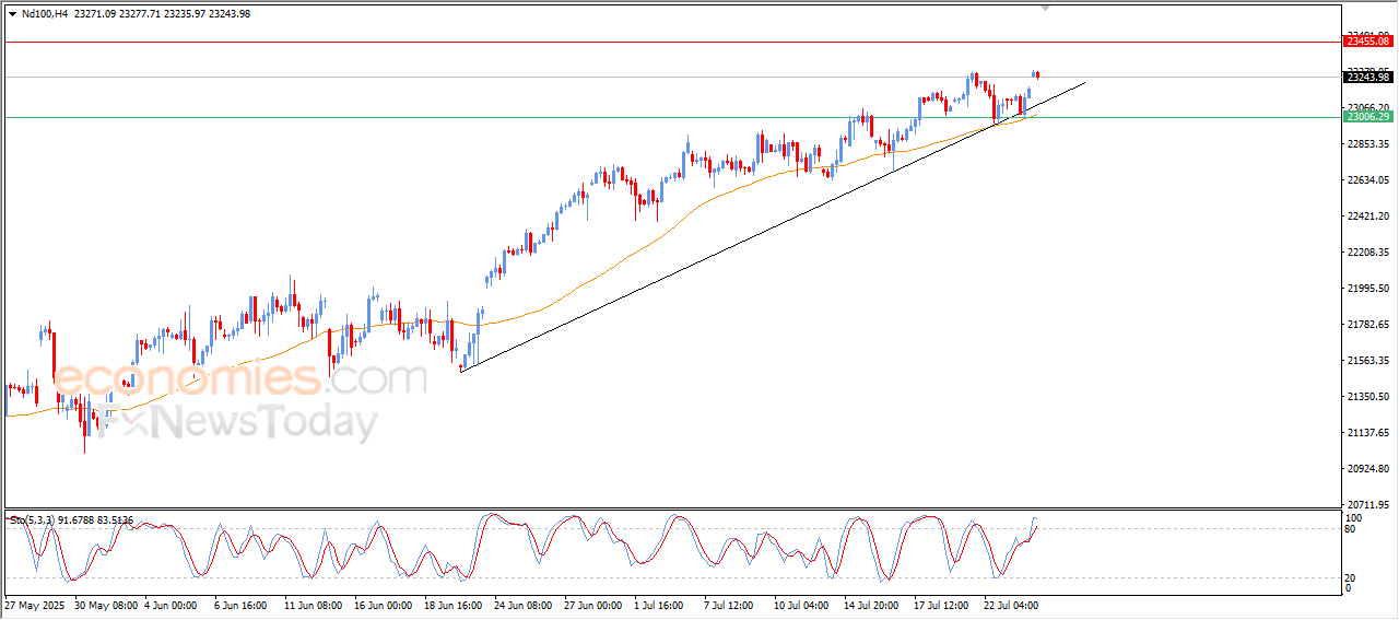 لذلك تشير توقعاتنا إلى ارتفاع مؤشر ناسداك 100 بتداولاته اللحظية القادمة، طيلة ثبات الدعم الرئيسي 23,000، ليستهدف مستوى المقاومة 23,450.
