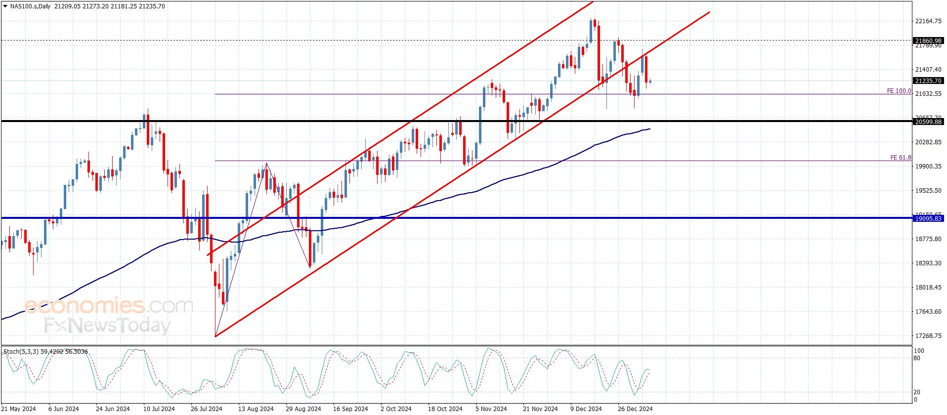 نتوقع بثبات مؤشر ستوكاستيك فوق مستوى 50 تعزيز فرص اكتساب السعر للعزم الإيجابي الإضافي ليمكنه ذلك بتشكيل موجات صاعدة جديدة ليكرر محاولات الضغط على المقاومة المذكورة سابقا والتي بتجاوزها سينجح بالثبات ضمن محاور القناة الصاعدة وليبدأ بتسجيل مكاسب جديدة باندفاعه نحو 21860.00 و22100.00.