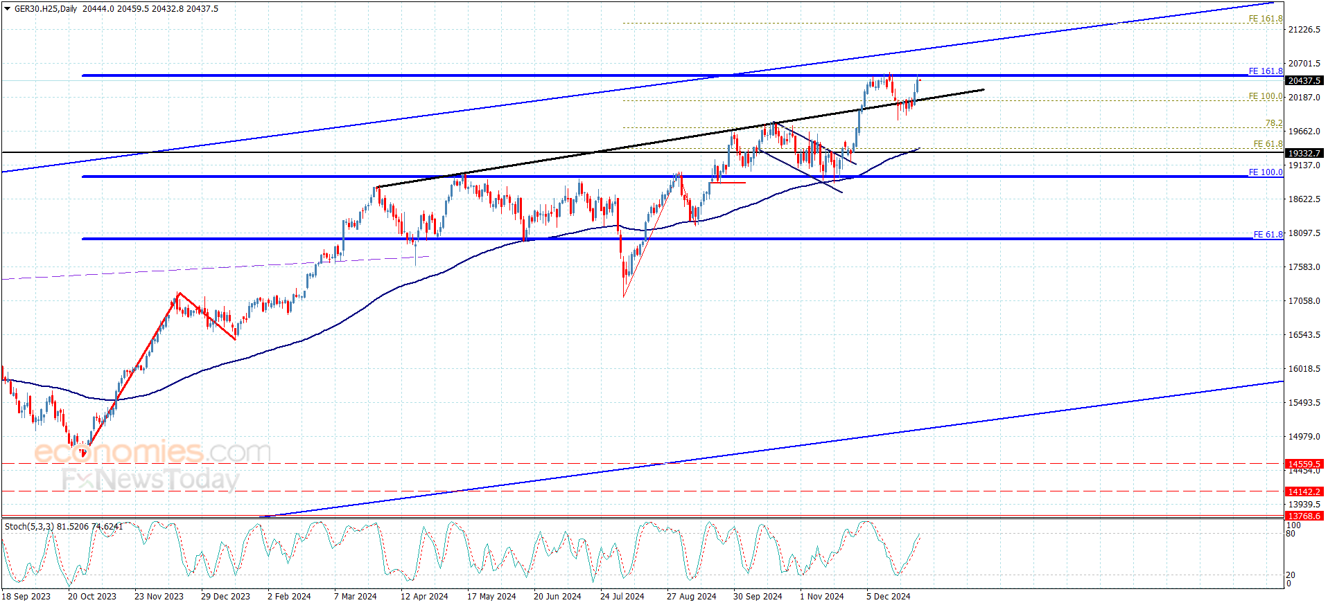 نلاحظ من الرسم المرفق محاولة تسلل مؤشر ستوكاستيك لمستوى تشبع الشراء ليزيد حاليا الضغط الإيجابي على تداولات السعر وليزيد من فرص تجاوزه للقمة الحالية والبدء باستهداف محطات تاريخية جديدة بانجذابه نحو 20660.00 وصولا نحو 20880.00.